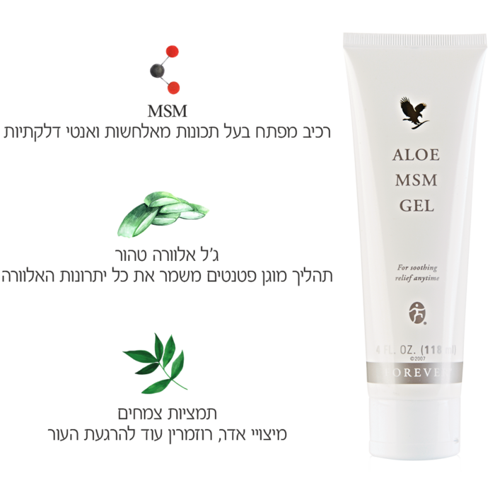 MSM היא תרכובת אורגנית של גופרית והמינרל השלישי בתפוצתו בגוף. שילבנו זאת עם אלוורה טהורה ומיוצבת, ויטמין E ותמציות צמחים ויצרנו ג'ל מרגיע. ג'ל אלוורה MSM מכיל תמצית עלי רוזמרין, חומר מייצב שמושך מים אל העור. ג'ל זה נספג במהירות, קל למרוח אותו אבל קשה לעזוב אותו כשמרגישים את השפעתו המרגיעה.