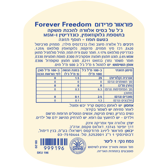 נערו היטב לפני השימוש. בהנחיית משרד הבריאות הישראלי 5 מ"ל עם כוס מים על קיבה ריקה. המלצה בינלאומית: 120-60 מ“ל ליום בבוקר, על קיבה ריקה. יש לשמור בקירור לאחר הפתיחה. מוצרי Forever הם אינם תרופה ואינם מיועדים לרפא מחלה כלשהי. ההסתמכות על המידע המפורט להלן היא על אחריות הקורא בלבד ומומלץ להתייעץ עם רופא מוסמך טרם רכישת מוצר כלשהו. הנתונים המדויקים מופיעים על גבי המוצר, אין להסתמך על הפירוט המופיע באתר, יתכנו טעויות או אי התאמות, יש לקרוא את המופיע על גבי אריזת המוצר לפני השימוש. התמונות והתאריכים המופיעים הינם להמחשה בלבד ואין להסתמך עליהם.