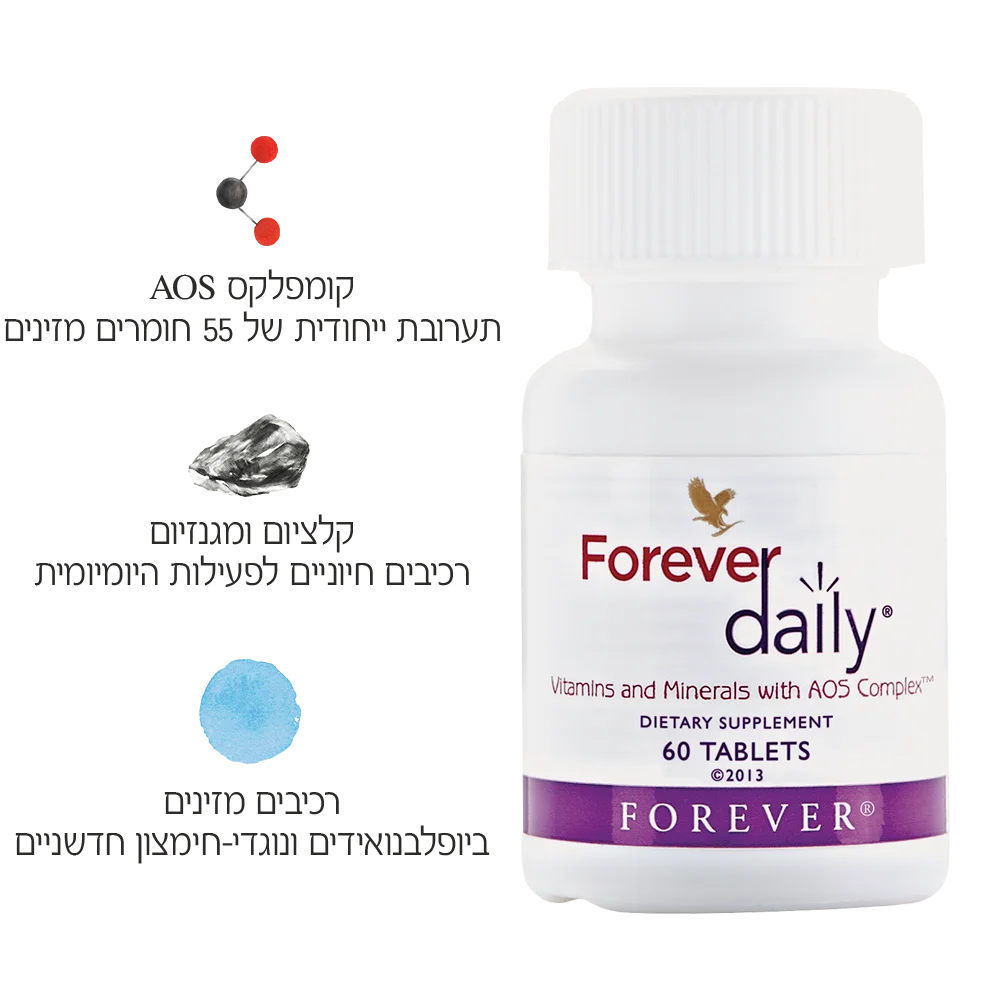 תערובת AOS [קלציום ביסגליצנאט חלט, מייצב (מיקוקיסטלין צלולוז, מונע התגיישות סיליקון די אוקסין), מגנזיום ביסגליצינאט חלטה, פלוונאיד הדרים, לוטאין, אבקת ליקופן, קואנזים Q10, אבקת מיץ אלוורה Aloe barbadensis)), זאוקסנטין, הספרידין] תערובת פירות וירקות [אבקות של: תפוחי עץ (Malus domestica), סלק(Beta vulgaris L.), פלפל אדום (Capsicum annuum), עגבניות (Lycopersicon esculentum), תות שדה (Fragaria x ananassa), חמוציות (Vaccinium macrocarpon), אצרולה (Malpighia glabra L ) תרד (Spinacia oleracea L.), כרוב (Brassica oleracea capitata), בצל (Allium cepa), מנגוסטין (Garcinia mangostana L.), אסאי (Euterpe oleracea Mart), דמדמניות שחורות ((Rubus fruticosus רימונים (Punica granatum), אוכמניות כחולות (Vaccinium corymbosum), ברוקולי (Brassica oleraca italica), קייל (Brassica oleracea var. sabellica), גזר (Daucus carota sativa), דלעת (Cucurbita pepo), ענבים (Vitis vinifera)], חומצה אסקורביט, מייצב חומצה סטאריט, פרוס ביסגליצינאט, מייצב סודיום קרוסקרמלוז, די אלפה טוקופריל אציטת, אבץ ביסגליצנאט, ניאצין, חומר טעם וריח אתיל וונילין, רטיניל פלמיטאט, נחושת ביסגליצינאט, די קלציום פנטותנת, פוטסיום יודין, חומרי ציפוי [סודיום קרבוקסימטיל צלולוז, דקסטרין, דקסטרוז, מדיום צ'יין טריגליצרידים, מווסת חומציות טריסודיום ציטראט], אל-סלנומטיונין, מנגן ביסגליצינאט, ביאוטין, חולקלציפרול, ריבפלאווין, תיאמין הידרוכלוריד, פרידוקסין הידרוכלוריד, פרידוקסאל 5 פוספאט, ציאנוקובלמין, כרומיום פיקולינאט, חומצה פטרוילמונוגלוטאמית, סודיום מוליבדאט.