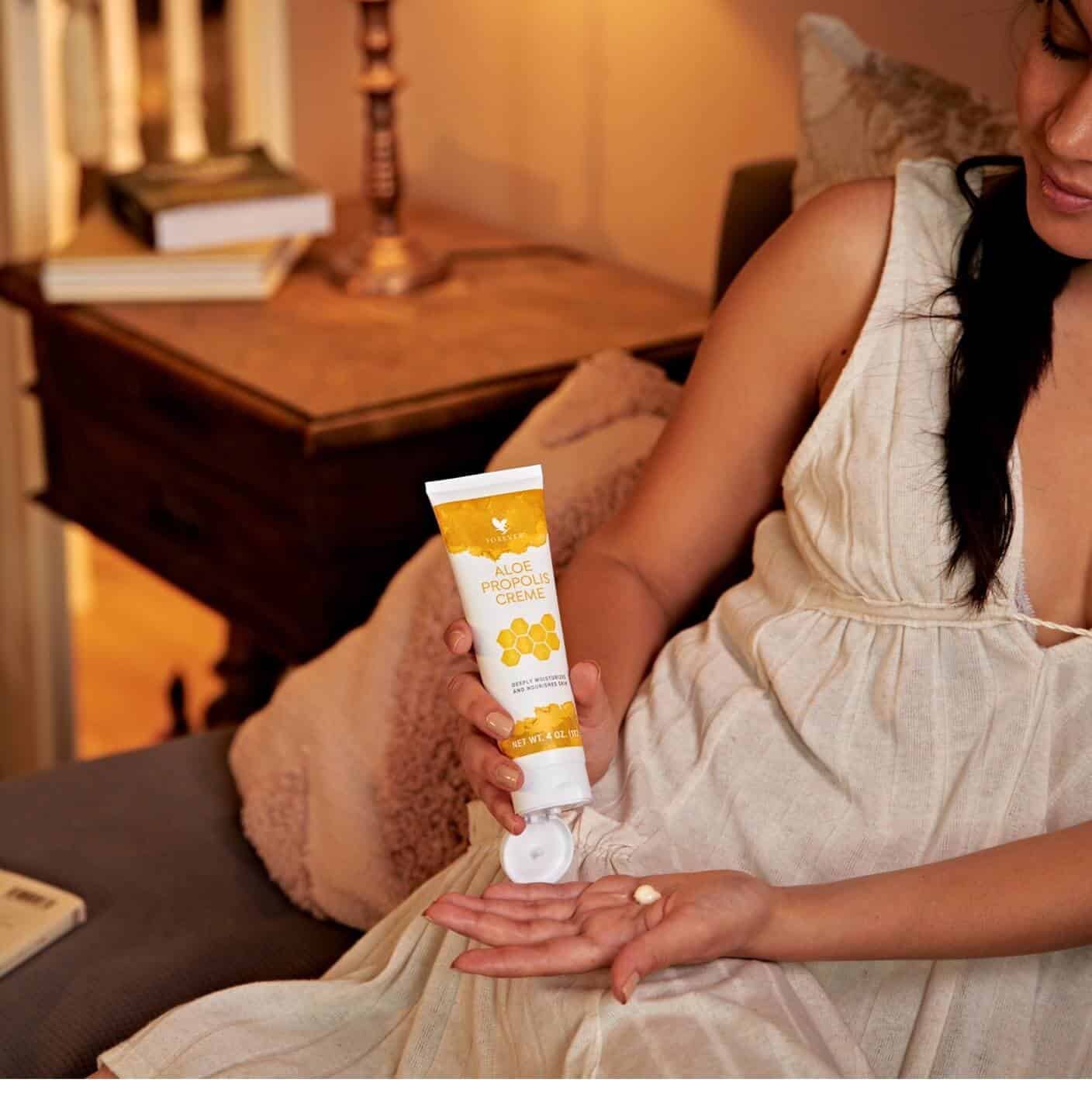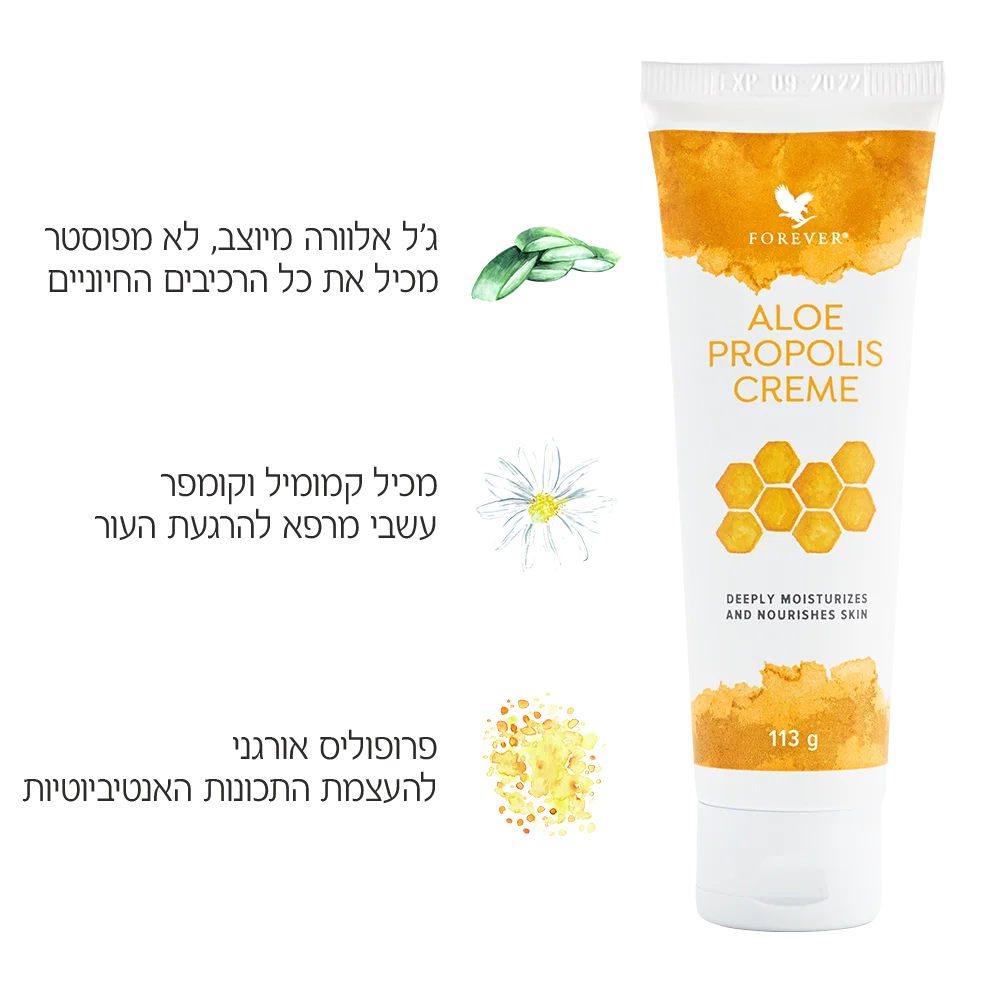 קרם טיפולי ייחודי בזכות שילוב של אלוורה מיוצבת ופעילה עם פרופוליס אורגני, הנודעים בפעילותם היעילה על העור: כושר החדירה של ג'ל האלוורה המיוצב, עם מרכיביו ותכונותיו האנטיביוטיות והאנטי ויראליות המגוונות של הפרופוליס. קרם סמיך זה מלא גם בויטמין A ו-E, ומועשר ברכיבים בוטניים כמו קמומיל וקומפרי.